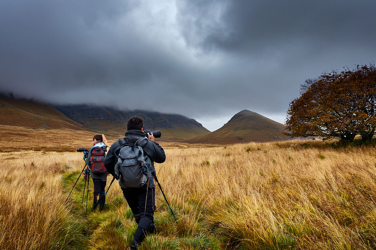 Image générée par l’IA Psp avec le prompt suivant : «mettre en situation des photographes à l'affût dans un paysage de campagne un jour de mauvais temps».