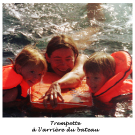 On se baigne depuis le bateau. Les gamins sont maintenant à l'aise pour monter et descendre l'échelle tout seuls et ils restent dans l'eau, avec leur gilet BIEN SUR ! sans qu'on ait besoin de les tenir…ça les " éclate " même quand on les tire sur le dos.
