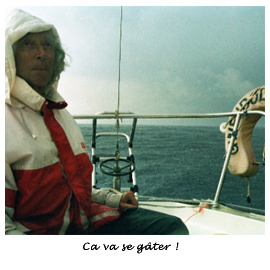 Enfin quand même ça se calme alors que l'on commence à voir la terre et l'on remonte petit à petit jusqu'au génois lourd et pour finir jusqu'au moteur car il n'y a plus de vent ! On en est tout éberlués, c'est à croire que l'on à rêvé…Mais l'état d'humidité de nos vêtements et de l'intérieur de la cabine (ce bateau c'est un peu un sous-marin dès qu'il y a de la mer) nous servent de " garde-fou ".