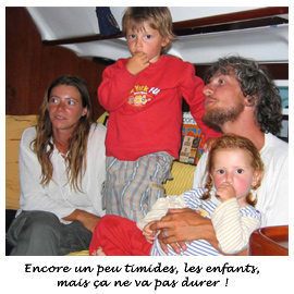 Le couple est fort sympathique et nous raconte avec un peu de nostalgie leur premier bateau de 7m avec leurs deux gamins à bord de l'age de Théo et Elodie. A bord de leur nouveau bateau, ils ont tout un équipement ultramoderne dont un pc portable avec les cartes marines du monde, GPS bien sûr, et appareil photo avec lequel le monsieur nous prend en photo tous les quatre. Photo désormais célèbre sur Photophiles ! Ah c'est quand même bien pratique ces portables…
