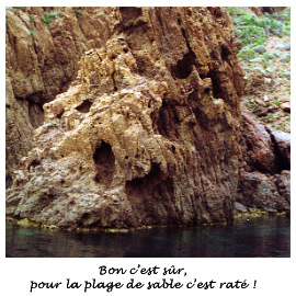 Bref vers 9h on arrive quand même à une anse qu'on avait repéré la veille en plein dans le parc de Scandola. On va donc y mettre notre ancre en se calant entre deux falaises rouges. Le site est franchement merveilleux. Rouges, ocres, mer bleue en dessous de ces falaises et profils acérés, avec en plus une végétation d'un vert lumineux… Bref c'est l'extase… Les enfants n'en ont rien à foutre par contre ils sont contents car au fond de l'anse il y aune plage… On débarque dans la minute qui suite notre arrivée et on lâche nos fauves pendant trois heures… ils en ont bien besoin, ça les défoule et ça nous repose ! Pique-nique sur la plage puis sieste au bateau. Je ne résiste pas à l'envie de pêcher… dans un parc national c'est scandaleux, oui je sais, mais comme dis Xavier, "c'est pas pour c'que tu pêches…" Je me mets donc à la pêche avec la furieuse envie de sortir quelque chose histoire de faire taire les mauvaises langues !