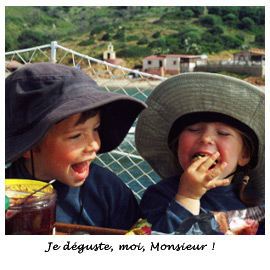 Ensuite petite soirée visite de la citadelle en mangeant des glaces trois fois plus grosses que la tête des enfants. Le résultat est bien sûr grandiose : du chocolat barbouillé de la tête au pied ! Les passants se retournent même sur leur passage, certains les évitent scrupuleusement (z'ont pas tort d'ailleurs, car mon pantalon tout propre du jour est déjà noirci de chocolat…). Après avoir semé la zizanie sur les quais de Calvi, on s'en retourne tout contents à notre petit bateau. On a pris soin avant de monter à bord de débarbouiller nos deux lascars ! Sinon c'est le carnage assuré à bord !