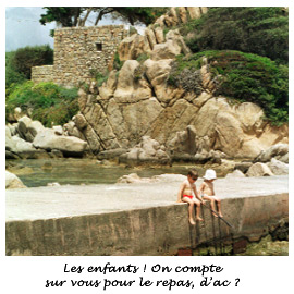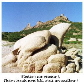 On en profite pour aller se balader à travers le maquis avec les enfants… On mitraille de photos les superbes points de vue sur le bateau et la mer. La balade est très chouette quoiqu'un peu piquante ! Aie ouille patatouille ! Les rochers ont des formes étonnantes, on voit tantôt des becs d'aigles, des casques, des visages, des oiseaux, des souris… Bref que de monde dans ce maquis ! Une vraie foire ! En tout cas, ça fait travailler l'imagination des enfants !