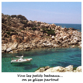 On débarque sur la plage au fond de l'anse pour pique-niquer à l'abri d'un arbre (à l'abri du soleil bien sûr, pas de la pluie ! C'est fini, c'temps là). Petite baignade pour les enfants dans quelques centimètres d'eau (le fond de l'anse est une véritable pataugeoire pour les enfants ! Idéal !), puis retour au bateau. On reprend notre "longue route" pendant la sieste des enfants. La petite brise nous amène bien gentiment après le cap Sénétose à une superbe autre petite anse "La Cala Longa" où, une fois encore, tous les gros 12m sont dégoûtés de nous voir rentrer comme des fleurs. Le décor est splendide plein de rochers ronds dans une eau turquoise… Site hyper sauvage où il n'y a personne !!