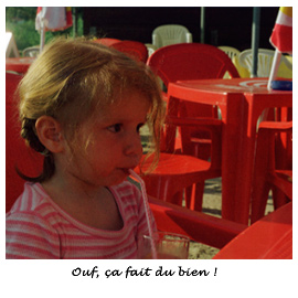 Deuxième crise de Théo dans la soirée ("j'veux pas mettre mes sandales" ou "j'veux pas me rincer les pieds"… je sais plus) sur la plage… Il hurle à tout casser et y'a plus grand-chose à faire pour le raisonner ! La douceur, la colère, la fessée, tout y passe mais y a rien à faire… Dans deux minutes, s'il ne s'arrête pas on va voir débarquer les flics, c'est sûr ! Tout le monde sur la plage a les yeux braqués sur nous ! C'est d'un agréable j'vous jure !... Bref, bref, passons…On arrive à le ramener à la raison et on part se boire un coup bien mérité pour les parents !