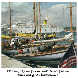 En fait sans le savoir on passe en plein milieu d'une régate de vieux gréements, alors bien sûr on fait un peu "tache" là au milieu, mais on est tout content de voir ces beaux bateaux sous voile… On arrive au port ; on se tâte pour savoir si oui ou non on va au quai d'honneur, en attendant de trouver une place plus adaptée… Heureusement qu'on n'y est pas allés, on aurait eu l'air malins au milieu des trois mats en bois et surtout devant le quai de 5m de hauteur !! Sans compter que c'était l'arrivée de la régate et qu'y avait les caméramans de TF1 et tout le tralala qui attendaient sur le quai d'honneur… Pour le coup ça aurait été une arrivée triomphante ! "Arrêtez les flashes, arrêtez les flashes : c'est pas nous !!" Donc avec notre discrétion et timidité naturelle on s'en va sur une petite panne bien peinard…