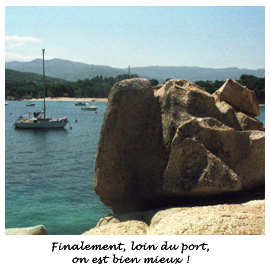 Je me réveille "la gueule explosée" par le manque de sommeil, mais bon tout va bien, on ne nous a pas détaché ! Aujourd'hui c'est sûr, on ne bouge pas, on ne fait rien, on se re-pose ! Et si y'a un corse qui s'approche du bateau pour nous déloger on lui dira qu'on a la peste, le choléra, n'importe quoi, mais en tout cas, non, non, on ne peut pas partir !