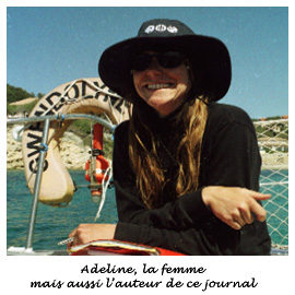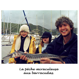 En fait, il y a un gars qui est en train de sortir "les fameux brochets" de l'eau et qui les vide au fur et à mesure ! Au début, on croit à une hallucination et puis en se dirigeant vers notre bateau on crois un Corse qui nous dit "ouah, j'ai failli en chopper un à la main, il m'a glissé entre les doigts, mais y'en a tout plein de partout, c'est incroyable !"… Et finalement on apprend que ce sont des barracudas qui se sont fait piéger dans le port par les tempêtes de vent qu'il y a eu et qu'en plus, une rivière ayant déversé toute sa vase, ils manquent d'oxygène et donc sont obligés de nager à la surface !