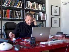 Alors que fasciné je contemplais à l'écran, et en avant-première, les résultats scannés de la toute dernière campagne chinoise du photographe-Burtynsky photographie toujours à la chambre 10 cm x 12,5 cm (4x5 inches) et en couleur-je fus invité dans son bureau. Passées les premières minutes en sa compagnie, deux choses dans le décor de la pièce retinrent mon attention. Devant une des deux vastes fenêtres dominant Spadina avenue, une des artères principales de la capitale économique du Canada, celle qui constitue la limite ouest du centre ville proprement dit, une boule argentée, métallique de près de 20 cm de diamètre flotte suspendue en l'air, sans aucun soutien visible, au-dessus d'un socle. Sur le mur qui fait face aux fenêtres, un vaste tableau de gouache, aquarelle représente de façon épurée, un puissant cargo. Burtynsky a plusieurs fois confié, lors d'autres interviews, comment enfant il regardait passer les immenses navires qui remontaient le canal Welland près de Saint Catherines (Ontario), à deux pas des chutes du Niagara (sublime quand tu nous tiens !), et amenaient les matières premières nécessaires aux chaudrons à la fois sataniques et producteurs de confort moderne de l'industrie ontarienne. C'est l'embauche que fournissait cette industrie qui avait motivé l'établissement de ses parents juste émigrés dans cette région ; c'est elle qui fournira ses premières expériences professionnelles au jeune Burtynsky. De son père amateur photographe, le jeune Edward gardera le goût de la pratique photographique, du décès d'un voisin, il héritera d'un laboratoire noir et blanc à domicile : étrange dualité. Prédestination ? Le monde d'Edward Burtynsky est essentiellement un monde d'hommes au travail dans un univers de production dont l'échelle semble toujours les menacer d'un anéantissement possible, une précarité et résilience de fourmi dans un monde disproportionné.