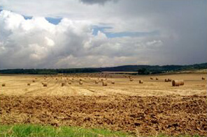 Pourquoi ne pas vous avancer dans le champ, vous rapprocher des balles de foin qui auraient marqué le bas du cadre de la photo, vous mettre au raz du sol, basculer un poil l'appareil vers le haut et ainsi mettre en évidence le ciel. Ou alors, basculer vers l'avant et ainsi mettre les balles en évidence. C'est l'un ou l'autre.