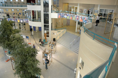 photographieIl faut dire que le grand Hall du Lycée Mme de Staël est impressionnant : une spacieuse architecture contemporaine dont l'immense espace central s'étend du sol aux arceaux d'acier de la verrière. La tour vitrée de l'ascenseur est attenante à l'escalier central qui conduit aux deux étages par des coursives turquoise carrossées de blanc. Les alignements de spots intégrés et les portraits d'élèves stars qui surplombent l'entrée confèrent à cet ensemble un style cinématographique bien agréable.