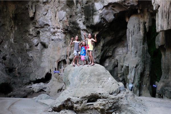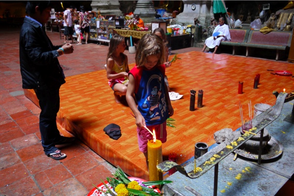 Il y a beaucoup de grottes où l’on peut trouver des statuts de Bouddha, c’est un lieu de prières et d’offrandes. Alors nos enfants ont suivi le rituel avec les fleurs et l’encens et ils ont pu mettre à la fin la fine feuille d’or sur Bouddha.