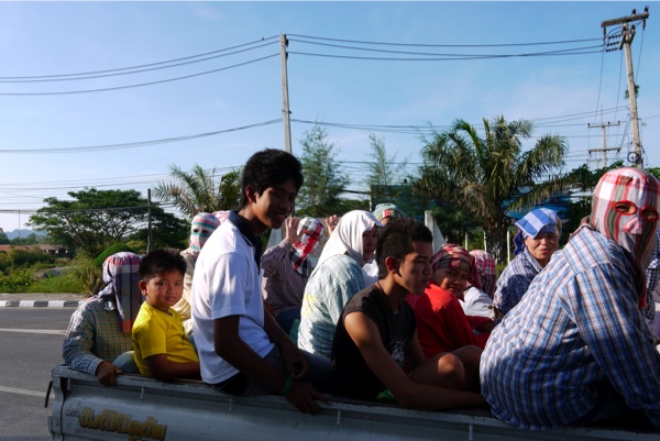 En remontant vers Bangkok, nous avons longé la côte ouest puis traversé sur la côte est. Au passage nous avons rencontré beaucoup de champs d’arbres à caoutchouc. Ces grandes feuilles, c’est du caoutchouc qui a séché au soleil.