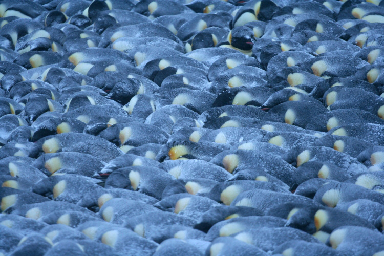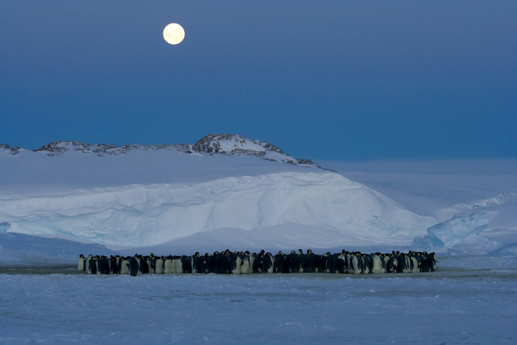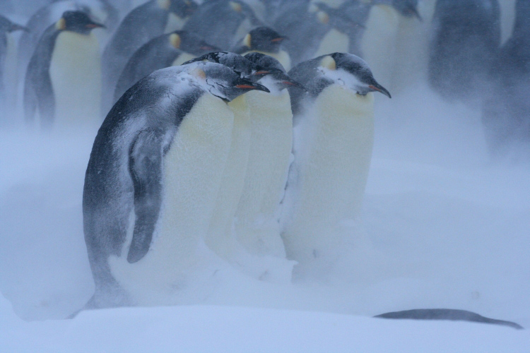 Paradoxalement, celui-ci reste à ce jour le plus beau moment de ma vie, malgré quelques instants difficiles, coupés de tout et relié au monde par une simple connexion internet limitée. Comment ne pas garder en mémoire par exemple l’arrivée de l’unique espèce animale se reproduisant l’hiver en Antarctique, le Manchot empereur. Fin mars, venant de nulle part apparaissant sous forme de petits points noirs à l’horizon en colonne de quelques dizaines d’individus, il gagne chaque année leur site de reproduction pour y donner la vie. Ils seront ainsi près de 3 000 couples à se retrouver, parader et s’accoupler pour pondre un unique œuf au mois de mai alors que l’Antarctique enregistre ses conditions les plus extrêmes. En plus de leurs formidables adaptations individuelles pour faire face au froid et au vent, les Manchots empereurs adoptent la forme de la tortue afin de se tenir chaud les uns les autres, on appelle cela, la thermorégulation sociale. La température au sein de la tortue peut ainsi atteindre les 35°C alors qu’à l’extérieure il fait -35°C.