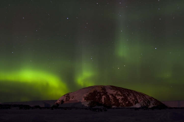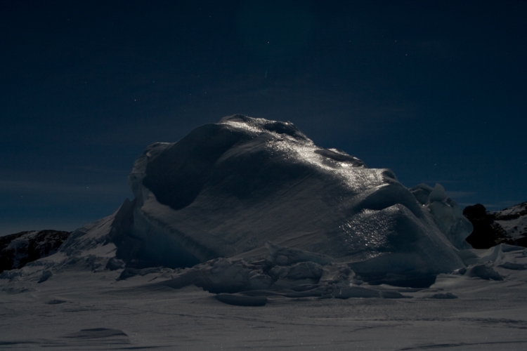 Mais l’instant que je garderai sans doute à jamais dans ma tête reste la nuit polaire. Quiconque ne l’a vécu pour de vrai, ne peut se rendre compte de l’impressionnant et de l’imposant moment. La nuit polaire s’installe peu à peu courant mars vers la fin de l’été, la durée du jour diminue considérablement et le soleil fini par fleureter avec l’horizon pour ne jamais en décoller au mois de juin. Le jour du solstice d’hiver, il apparaîtra aux alentours de 11h00 pour se recoucher à 14h00 semblant ne pas pouvoir lutter face à la puissance de l’obscurité. C’est à ce moment là, dans le ciel le plus pure, quand la nuit l’a emporté sur le jour que tel un ballet aérien, les aurores australes apparaissent. L’émotion vous surprend alors, dans le silence quasi parfait de la nuit polaire, parfois interrompu par le chant au loin d’un Manchot, ou le craquement de la banquise qui travaille sous l’effet des marées.