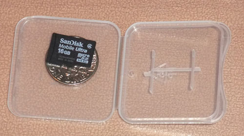 Surtout ne la confiez pas à Bébé ! S'il l'avale, adieu les souvenirs impérissables ! A peine plus grosse que l'ongle de mon index, cette minuscule carte mémoire contient 16 Go. Il y a donc intérêt à faire attention. Et comme le disait une pub des années 80, « toutti rikkiki, mahousse costaud », cette petite puce de mémoire a de quoi soutenir la comparaison avec ses grandes soeurs. Et encore, je n'ai pas celle contenant la plus grande capacité. Celle de 32 Go est disponible sur le marché et celle de 64 Go devrait paraître dans un avenir proche. Quand on pense aux vieilles disquettes des années 80, de plus de 20cm de diamètre (8 pouces à 2,54 cm) et ne pouvant contenir que 8 Kilo-octets (puis 16) soit une dizaine de pages de textes sur un A4, en noir uniquement. Mais ce n'est pas tout, car la petite taille c'est bien mais la performance est aussi au rendez-vous. Pour une micro carte qui peut se cacher derrière une pièce de 1 Dime (10 cents américains au diamètre de 17.91 mm soit moins de 2 cm) on a non seulement une grande capacité de stockage informatique mais une vitesse de transfert qui tient la comparaison, ça laisse songeur. Mais j'explique, je disserte, je ... au fait de quoi s'agit-il ?