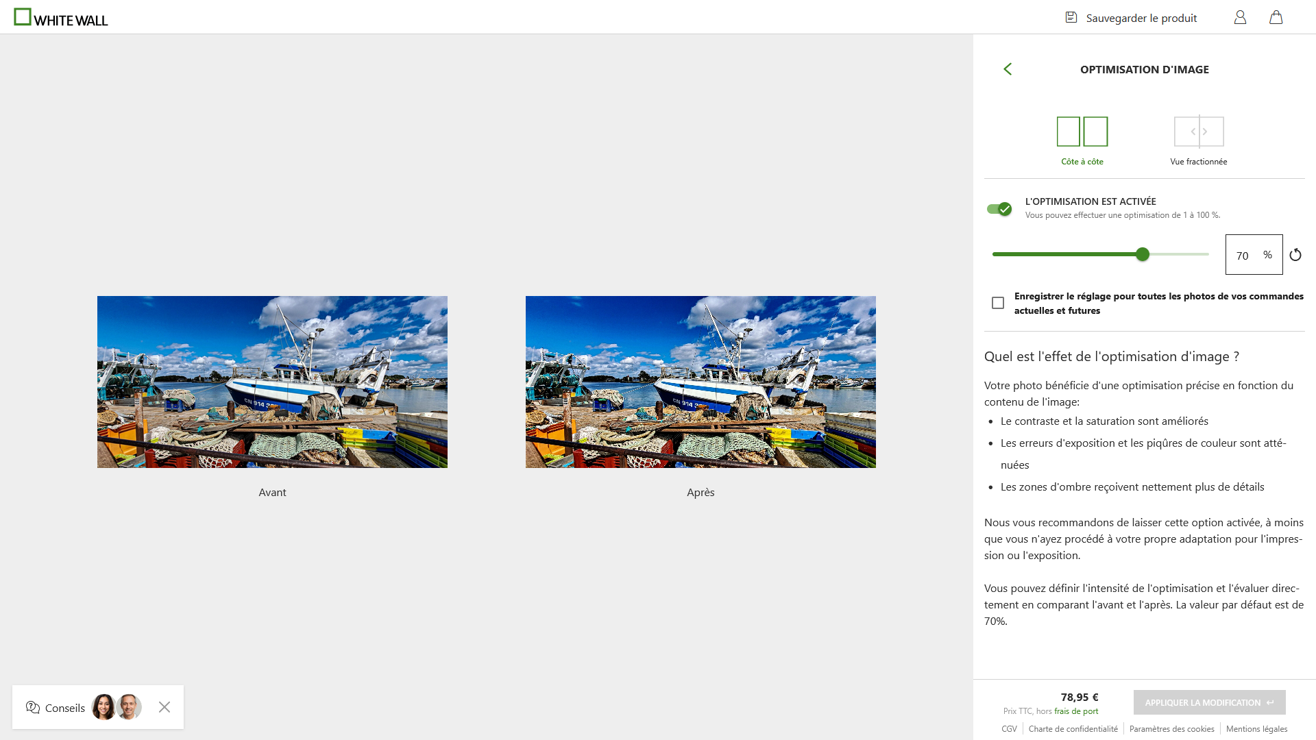 Il en est de même pour l’option WhiteWall UltraHD appliquée par défaut qui est censée d’adopter votre photo à la technique d’impression de l’image. Et, encore une fois, conservez cette modification faite par défaut pour un bon résultat. Mais, vous avez encore la possibilité de la décliner en cliquant sur le bouton WhiteWall UltraHD une fois son panneau ouvert.