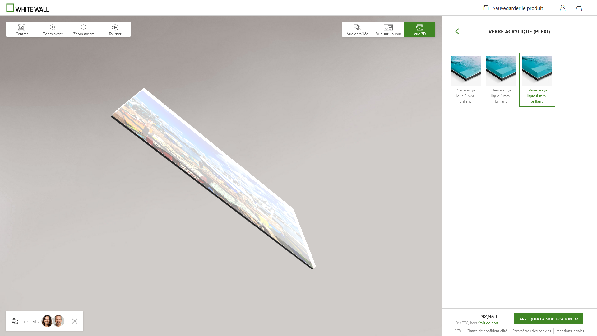 Vous avez le choix de trois épaisseurs du verre acrylique reposant sur votre photo. Cela peut donner plus de profondeur à l’image et mieux la protéger. De plus, l’option n’est pas trop élevée puisque passer de 2mm d’épaisseur, choix par défaut, à 6mm revient à 14€ de plus voire 6€ si vous optez pour l’intermédiaire, soit 4mm.