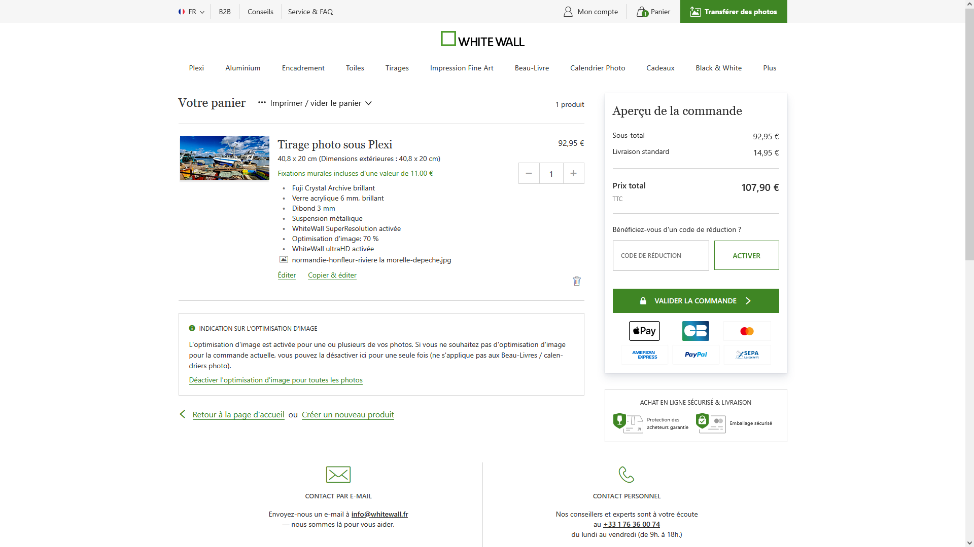 histoire de vérifier que tout est en ordre et qu’aucune erreur n’a été commise, une fenêtre, reprenant votre image avec toutes les options comprises dans le prix indiqué – remarquez que le système de fixation valant 11€ est inclus – s’affiche. Vous pouvez en toute tranquillité soit valider votre demande en allant dans votre panier, soit revenir sur vos critères.